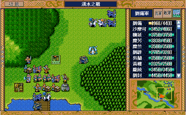 我 吴兰右二下一,魏延左一上一开始大火龙(本回合伤害步兵5),沙摩可上一开始(后不说明都是)大漩涡(本回合伤害步兵5,伤害步兵4二回合),庞统右二上一大火龙(二回合,本回合伤害步兵5),王平右二上一援助、糜竺上激励(从此不变位置)、刘封进宝物库援助王平(并拿1000金),糜芳进鹿砦援助、马良下方两格补给魏延,黄权右激励糜芳(从此不变位置),张飞左激励马良,刘备右下假情报曹洪,刘辟左四上一;