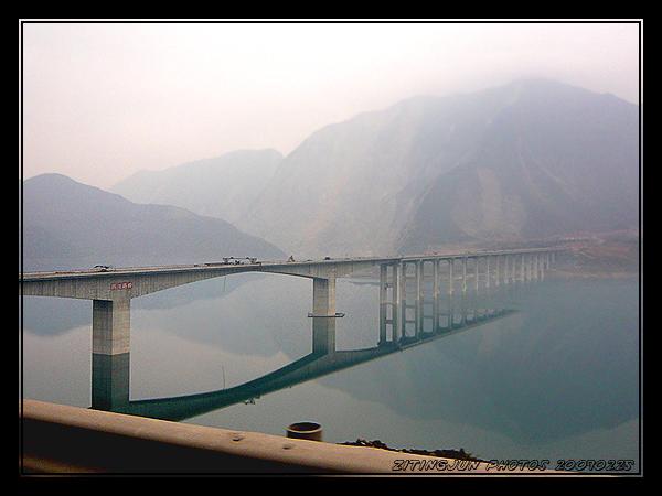 紫坪铺大坝后面。平静的水面把斑驳的山体显得甚是狰狞,想象当时的崩塌一定惊天动地。