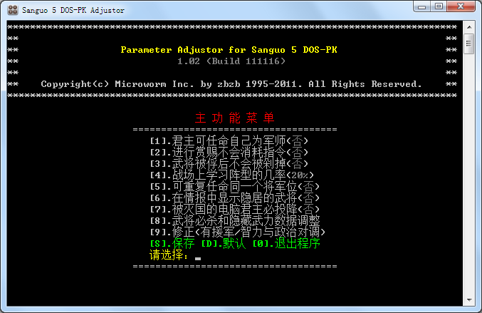 功能:用于修改三国志ⅤDOSPK版的一些游戏参数,包括暗加武力数据的调整。