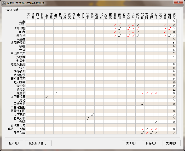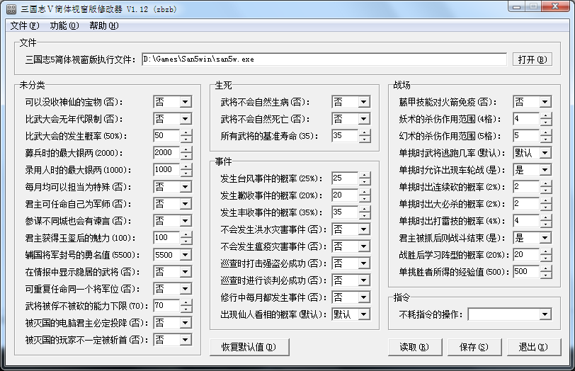 功能:可用于修改三国志5简体视窗版大量游戏参数;还可(1)修正个别宝物/武将名称的功能,(2)提供暗加武力调整功能,(3)调整宝物附加技能,(4)阵型附件参数调整等。