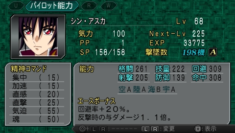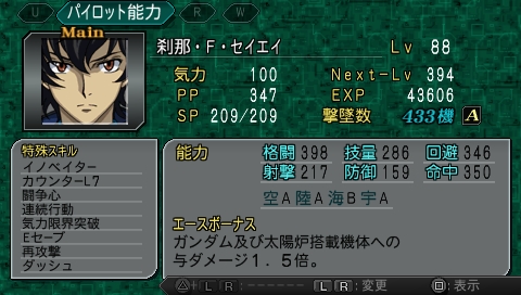 刹那:刚出场时机体很弱,很容易被爆,之后跟着剧情走,有着两到三次的强化(副机师沙慈会加入),最终机体满改,必杀7700,最高攻击(那个在有月亮场合并需要三个回力蓄力的月光炮真心不能算是最强的),消耗也不高,学会E技再装个150EN后,基本可以一个人清场,最后BOOS我也用他再动后再动,把BOSS干掉。另外一格芯片我装的是130气力后+300攻的那个,所以必杀攻击就达到8000。变革者技能后边出来——140气力,命回技+20,所以学个再攻击挺好的。气力突限和连续行为这两个都是作为主力必学的。其他PP值就堆点技量,技量堆到270,基本上都可以再攻击了。剩下就是格斗。