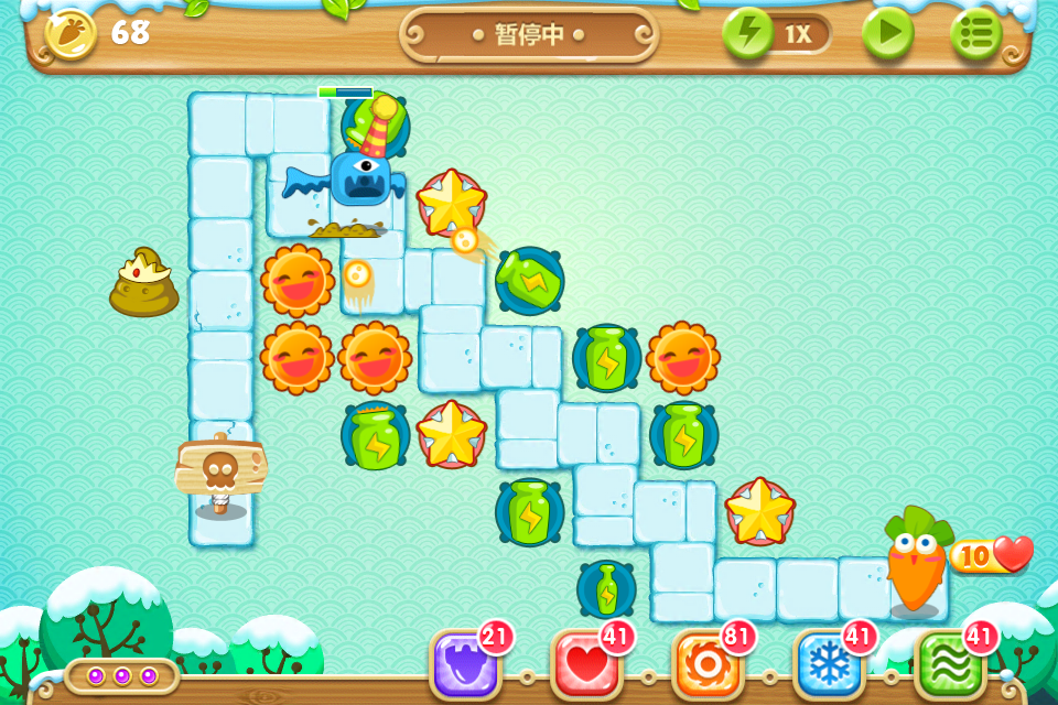 目标:不用魔法攻击,不用带技能的萝卜,全部65关收集金萝卜、水晶萝卜、全灭道具过关